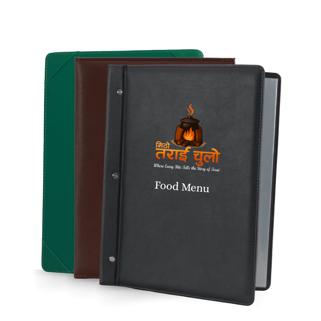 Enhance your restaurant, Hotel or café’s presentation with our premium menu covers. Crafted for durability and style, each cover can be personalized with your logo, adding a professional and unique touch that reflects your brand’s identity. Perfect for leaving a lasting impression on your guests.